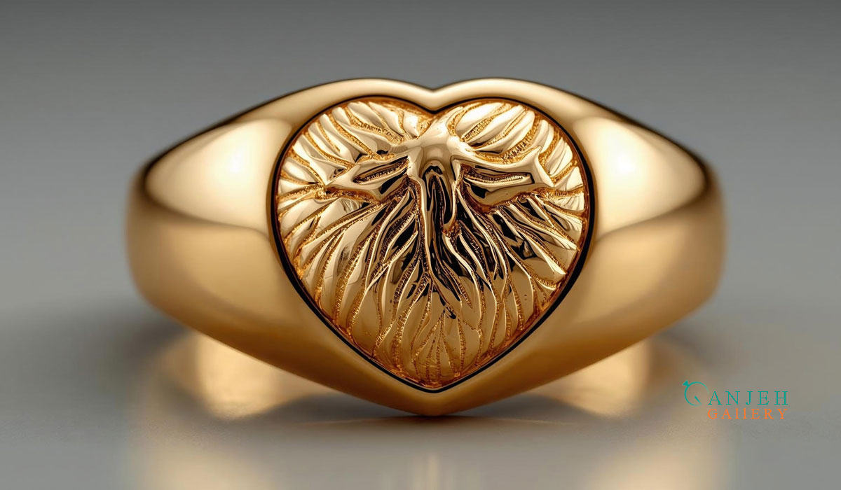 اینجا قلب، بزرگ و برجسته است؛ «انگشتر قلب طلا بزرگ» یا مدل‌های سیگنت که گاهی با حکاکی نام یا تاریخ شخصی‌سازی می‌شوند.