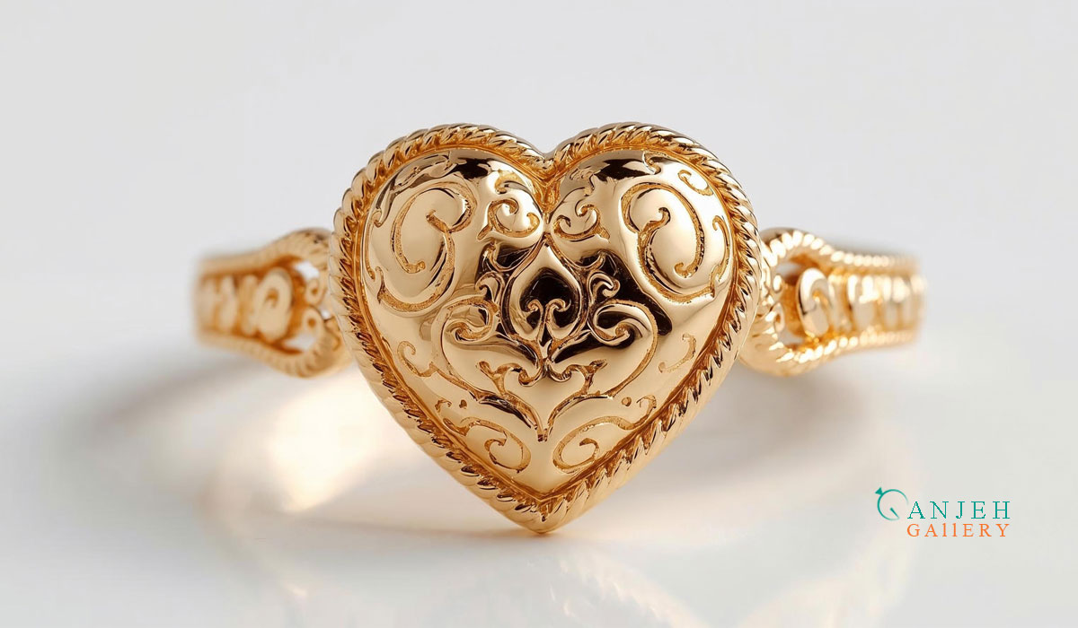 «انگشتر طلا دخترانه طرح قلب» با جزئیات کنده‌کاری، بافت‌های گل‌برگ‌مانند یا آویزهای قلب، حس عاشقانه‌ای از گذشته را زنده می‌کند.