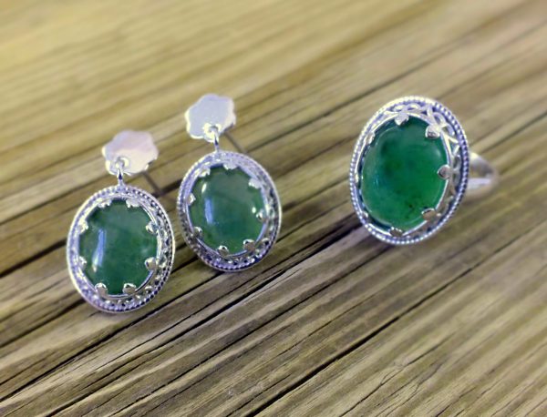وزن انگشتر 5.01گرم و وزن گوشواره 5.500 گرم طلای 18 عیار است. این نیم ست با سنگ عقیق سبز طبیعی و طلای سفید کار شده است.