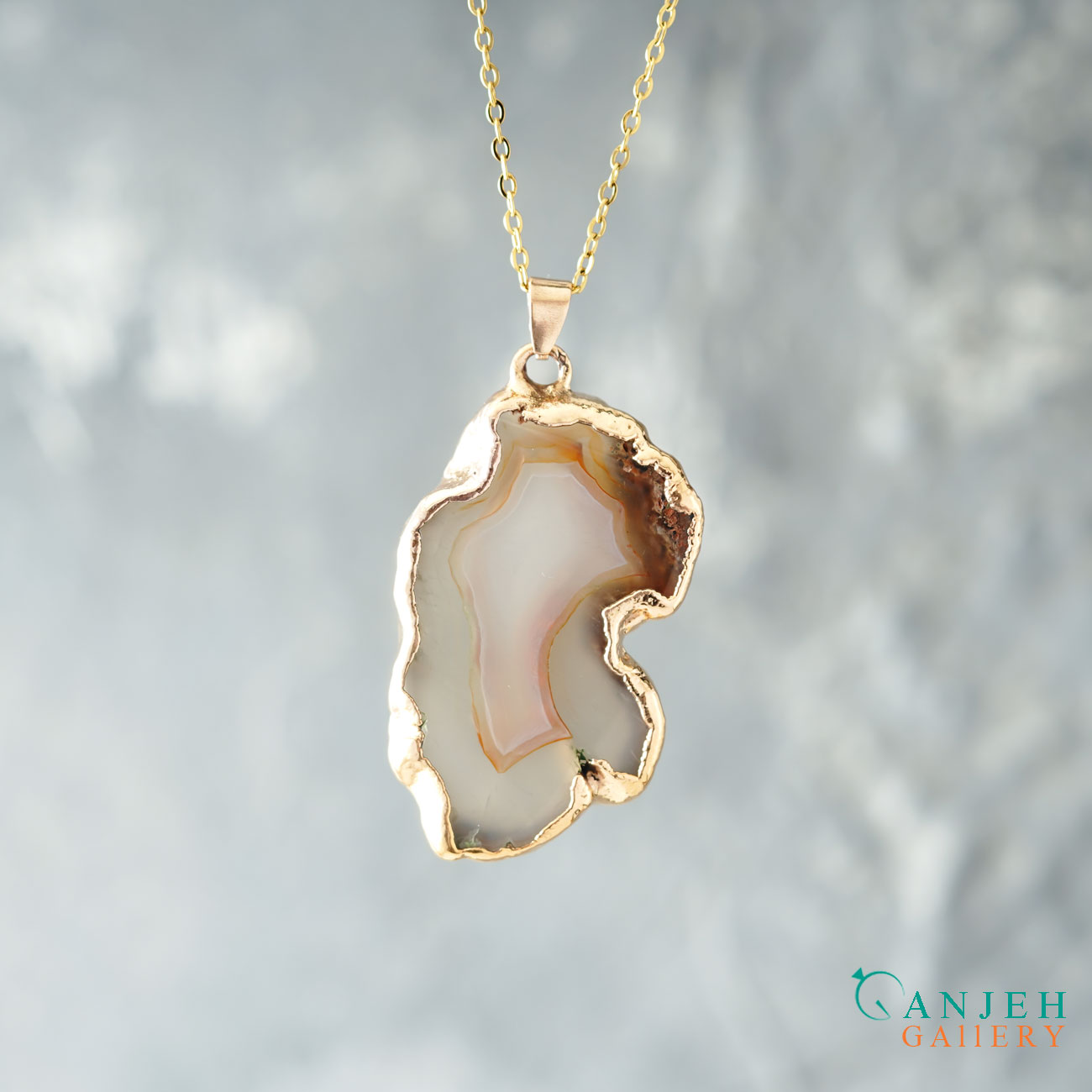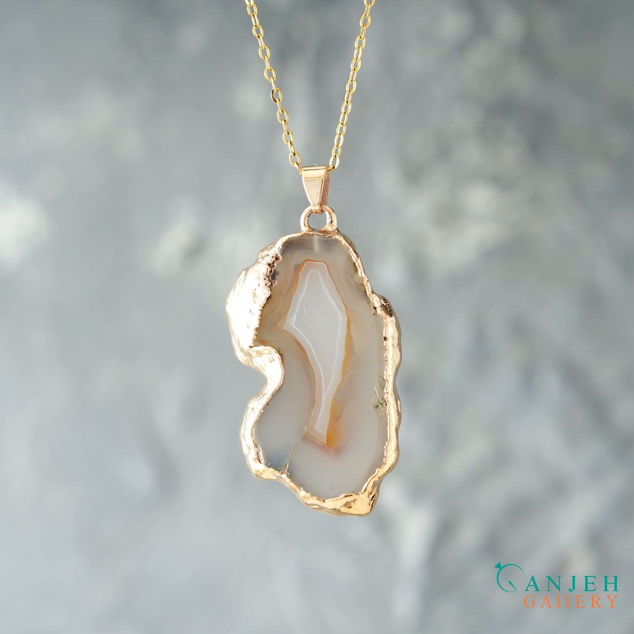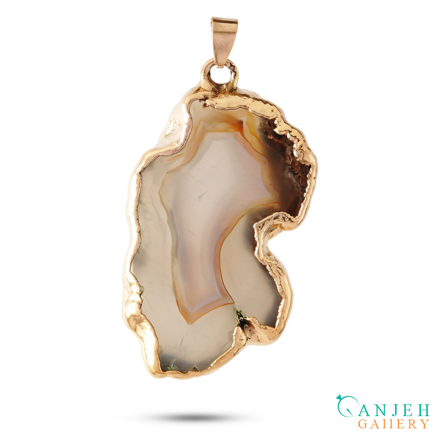 سنگ تنها برش خورده و پولیش شده تا فرم آزادش حفظ شود. قاب آبکاری طلا با روکش نانو، فقط نقش محافظ را دارد نه نقش غالب. پلاک بهصورت دوطرفه قابل استفاده است و هر سمت آن روایت متفاوتی از بافت عقیق را نمایش میدهد. وزن کلی گردنبند ۱۱ گرم است؛ سبک، متعادل و مناسب استفاده روزمره یا استایل خاص.
