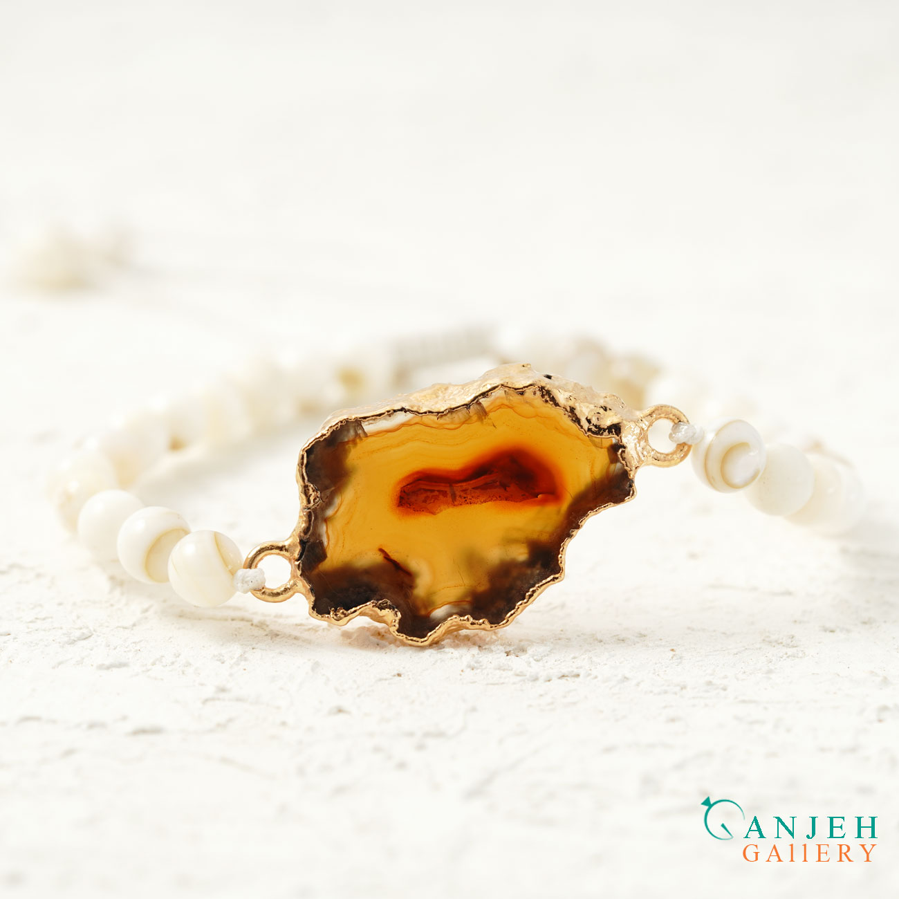 دستبند سنگی مهره ای عقیق و صدف کد N709 قبل از اینکه «زیور» باشد، تکهای از دل طبیعت است. پلاک عقیق پرتقالی آن از سنگ راف ایرانی گرفته شده؛ بدون رنگ، بدون احیا، بدون دستکاری اضافه. فقط برش خورده و پولیش شده تا همان چیزی که طبیعت ساخته، دیده شود. رگه سلیمانی قرمز که در مرکز سنگ نشسته، امضای طبیعی این قطعه است؛ طرحی که نه قابل تکرار است و نه قابل سفارش.