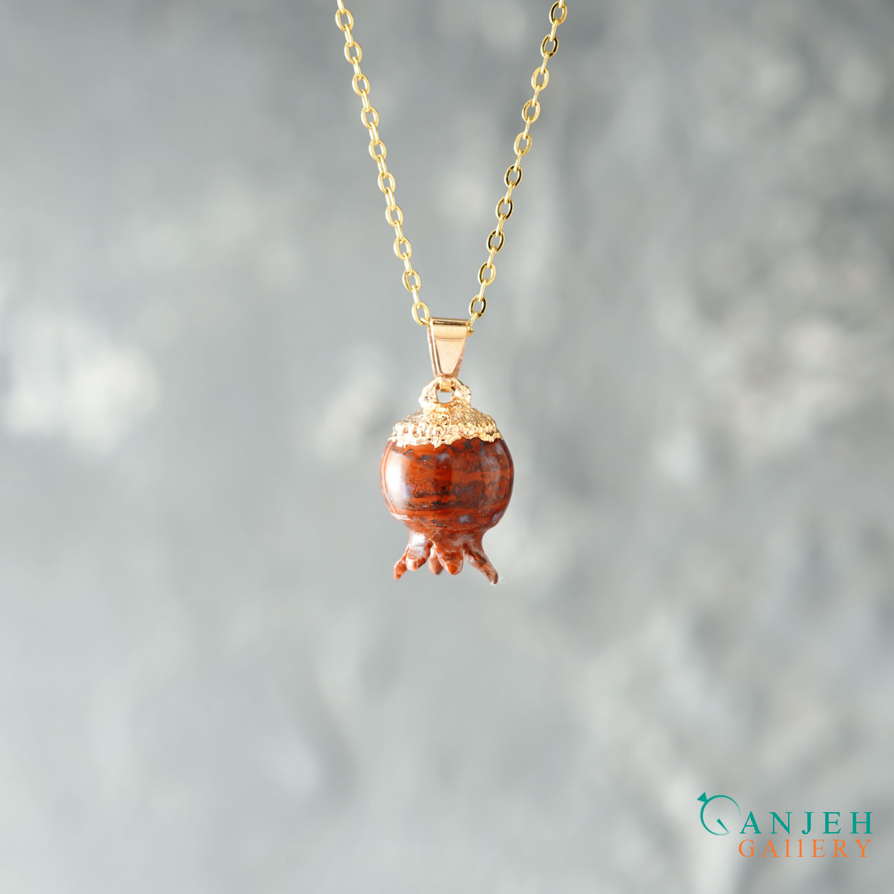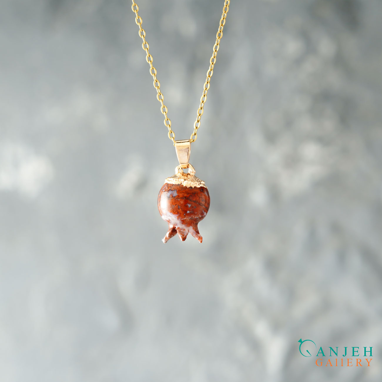 گردنبند سنگی انار جاسپر کد N704 نمونهای شاخص از تلفیق طبیعت و هنر دست است. این آویز خاص بهصورت کاملاً دستتراش از جاسپر قرمز طبیعی ایرانی شکل گرفته و هر جزئیات آن با دقت و ظرافت توسط استادکاران گنجه اجرا شده است. فرم انار، نماد برکت و انرژی، در این اثر با پرداختی دقیق و بافتی زنده جان گرفته و هیچ قطعهای مشابه دیگری نیست.